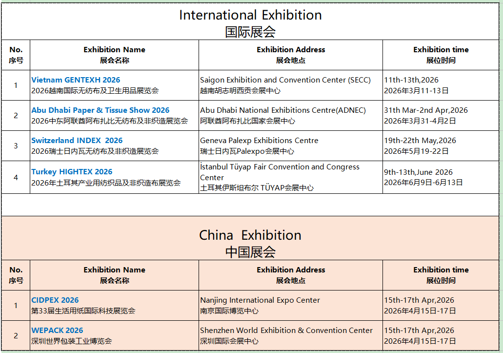 国際展示会: ベトナムGENTEXH 2026、アブダビ紙・ティッシュショー2026、スイスINDEX 2026、トルコHIGHTEX 2026